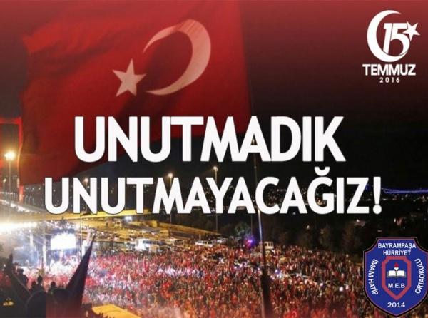 15 Temmuz 2016 gecesi meydana gelen elim hadise millet olarak hepimizi derinden yaralamıştır. Halkımız zorlu bir "demokrasi savaşı" vererek hainlerin emellerine ulaşmasına izin vermemiştir. Bu uğurda genç, yaşlı, çocuk, kadın demeden millet meydanlarda kirli elleri, ülkemizin üzerinden çekmiştir. Bu uğurda yaralanan gazilerimiz, canlarını veren şehitlerimiz olmuştur. Bu sebeple onlara olan şükran borçluyuz. Hürriyet İmam Hatip Ortaokulu ailesi olarak 15 Temmuz’u unutmadık unutmayacağız.